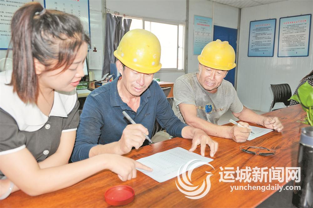 7月27日,两名在西建集团稷山分公司打工的农民工正领取工资。