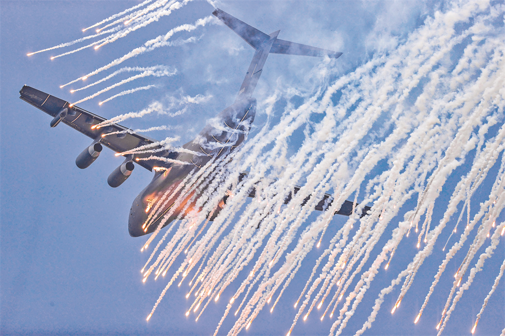 7月26日,在2023年空军航空开放活动·长春航空展上,运油-20释放红外干扰弹。