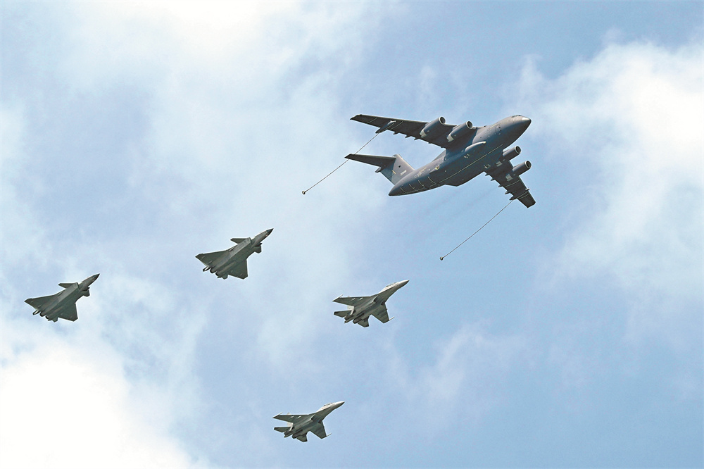 运油-20单机和歼-20双机、歼-16双机加油编队进行飞行展示