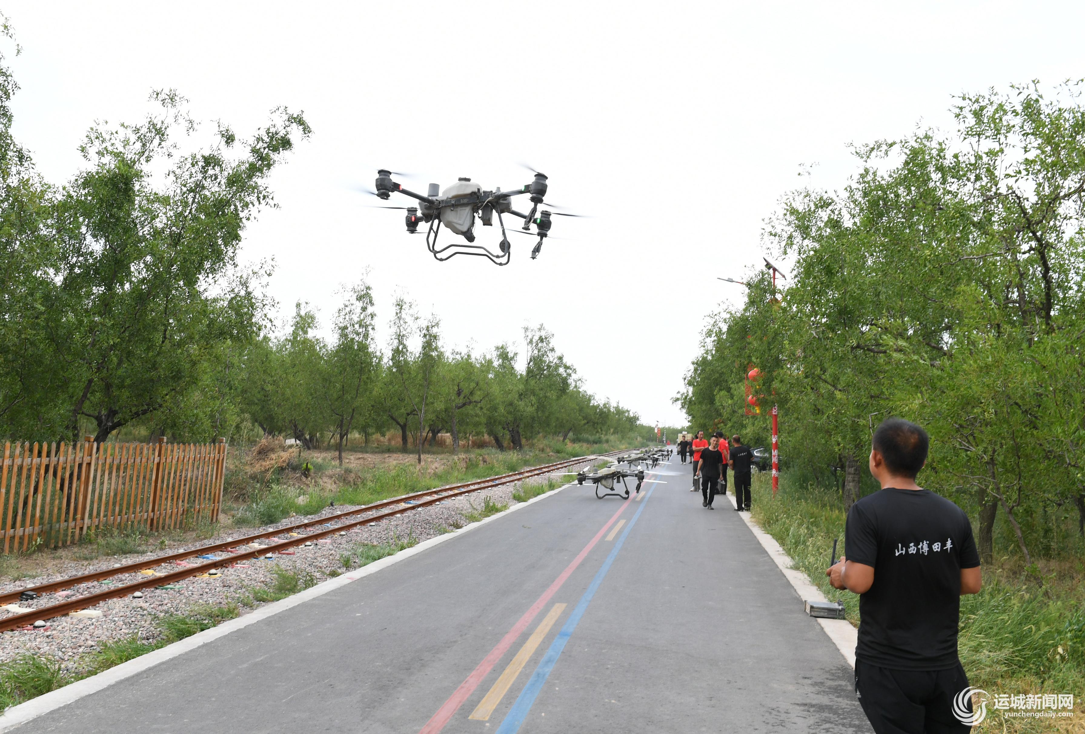 7月27日,稷山县稷峰镇陶梁村板枣园,无人机操作手在操作植保无人机给枣树喷洒农药。