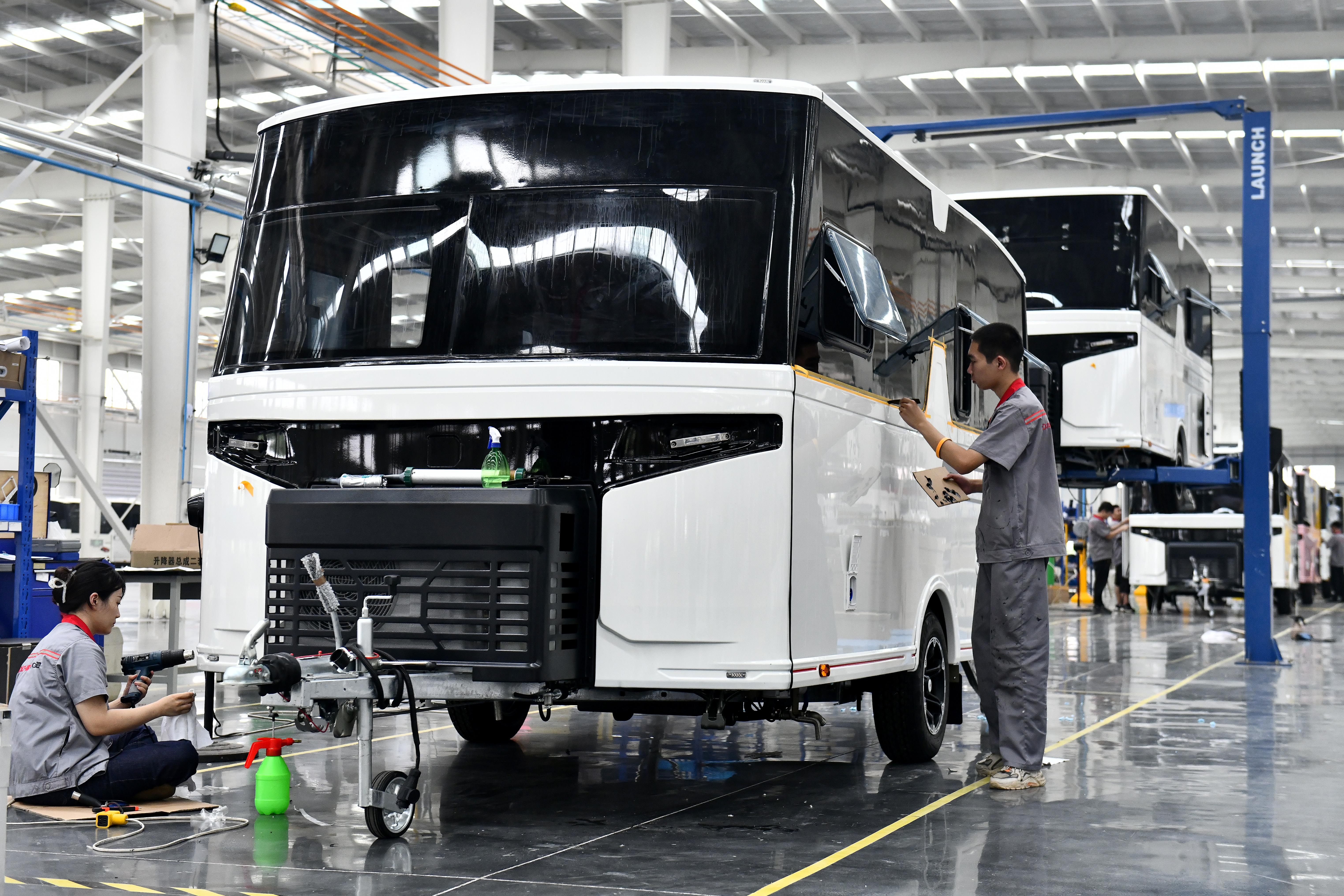 7月27日,在位于莒县的大驰智能房车(日照)有限公司,工作人员在装配房车。