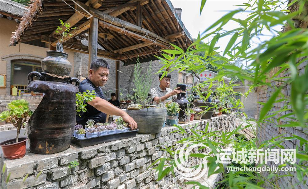 韩彬彬在农家乐内侍弄花草