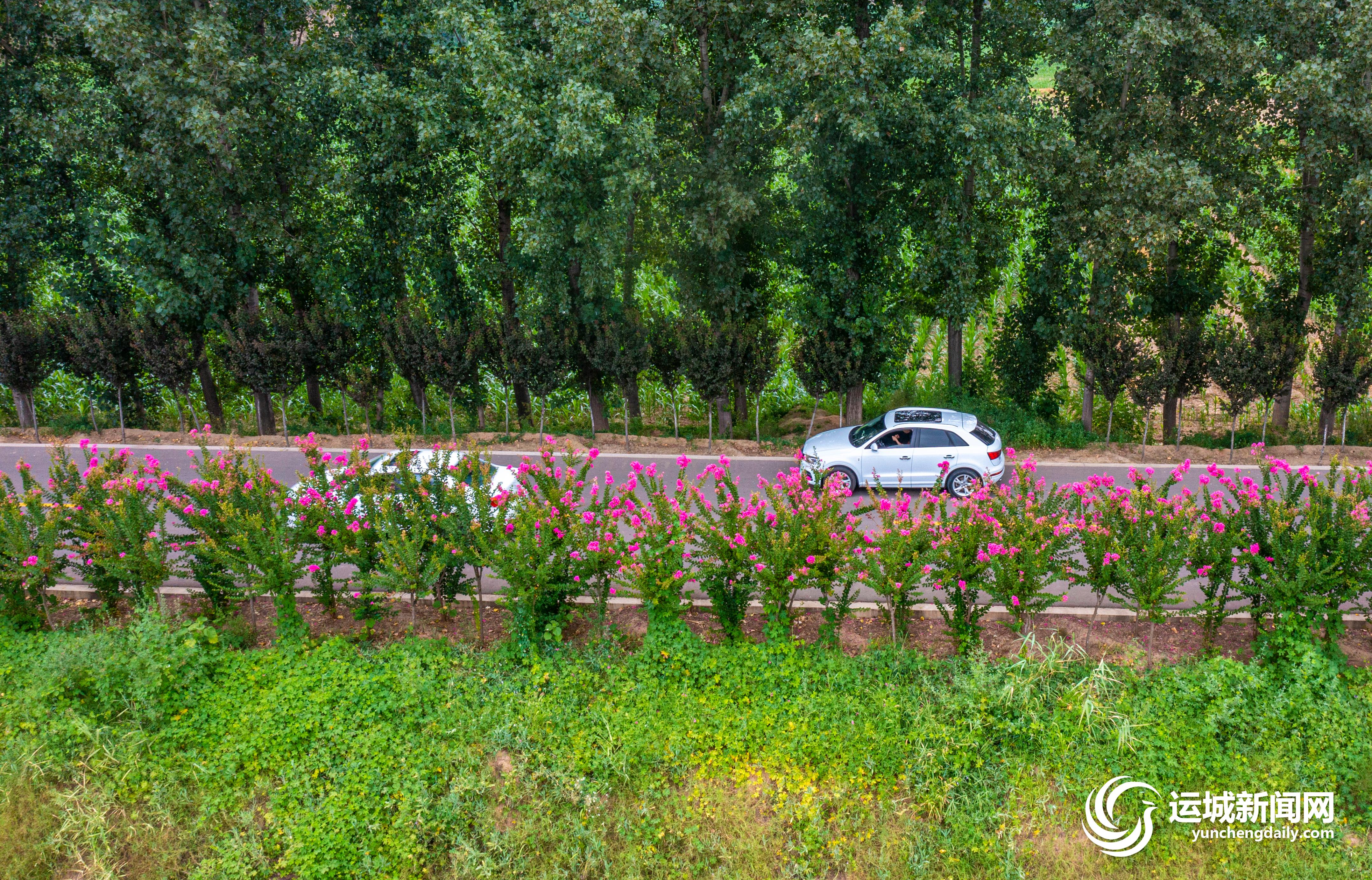 7月28日,一辆轿车从黄河一号旅游公路芮城段的绿色生态旅游长廊驶过。