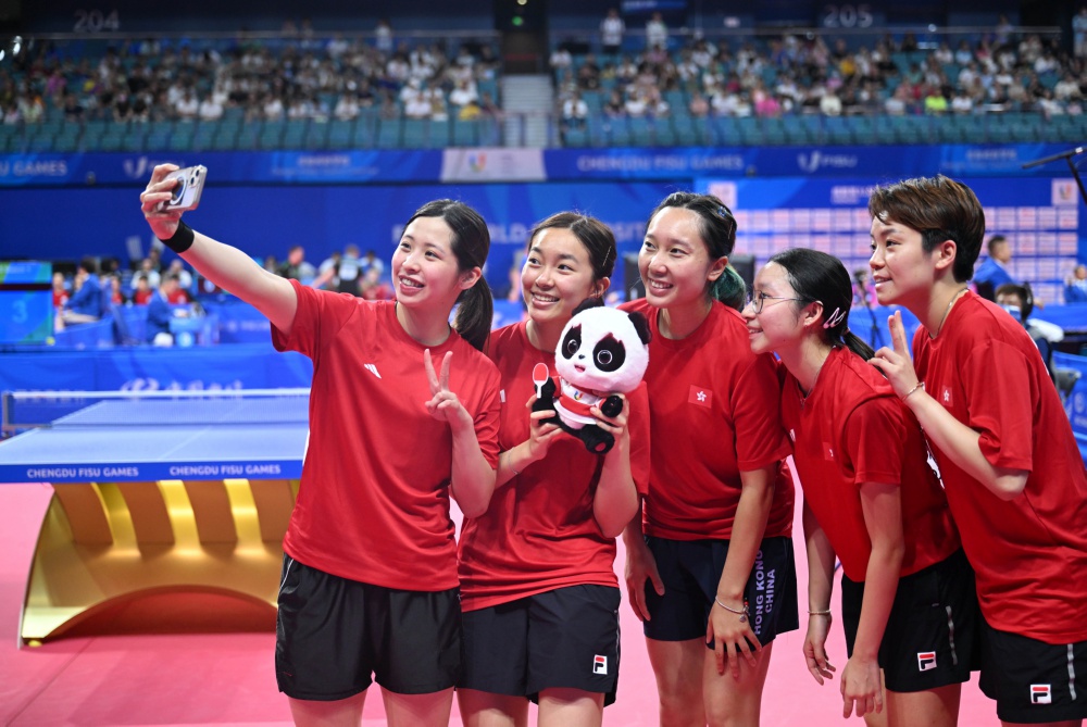 7月30日,中国香港队选手在赛后合影。当日,在乒乓球女子团体第一阶段比赛中,中国香港队以3比0战胜中国澳门队。 新华社记者 赵子硕 摄