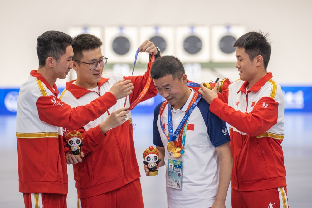 当日,在射击项目男子25米手枪速射团体决赛中,中国队获得冠军。