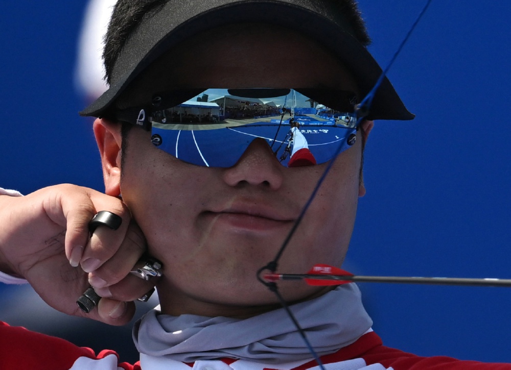 当日,在男子复合弓团体金牌赛中,中国队以231环比224环战胜法国队,获得冠军。 新华社记者 张龙 摄