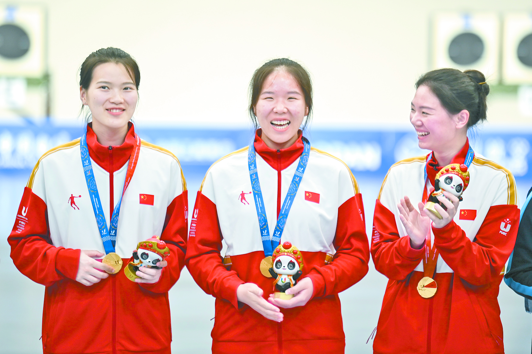 当日,在成都举行的第31届世界大学生夏季运动会射击项目女子25米手枪团体决赛中,由熊亚瑄、王珂怡、林雅茜组成的中国队获得冠军。新华社记者 曹祎铭 摄