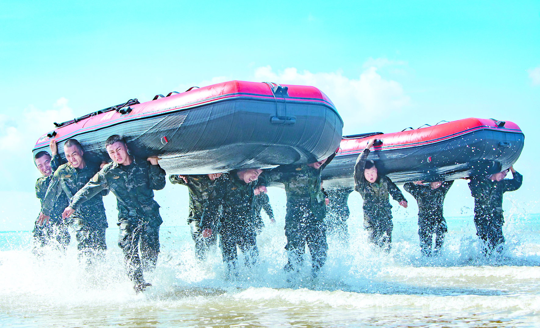 武警广西总队防城港支队官兵组织扛舟行进训练(7月31日摄)。