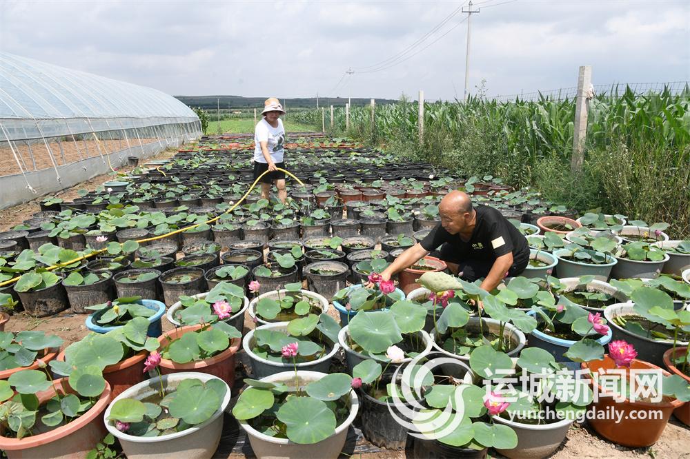 图为8月2日,闻喜县裴社镇祥和村村民王赵平及家人在自家房前的闲置空地上管理即将进入销售期的碗莲。