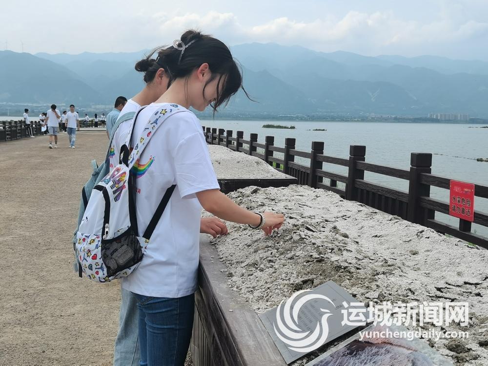 盐池岸畔,蕙风徐徐。走在盐池22号堤埝上,大学生们感受到了盐湖的辽阔,眺望远方,池水与天边相接,泛着一抹神秘的青蓝色。他们细细观赏了展示台上的盐湖航拍照片,只见堤埝纵横交错,像是广袤农田中的道道阡陌。展示台上还盛放着盐池生产的芒硝等化工原料,他们触摸着盐池结晶,体悟着千百年来河东人民在此洒下的辛勤汗水。