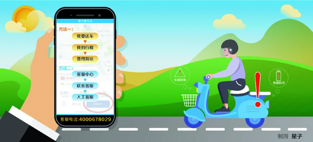 8月2日晚,市民郭女士在市区解放北路扫了一辆“小蓝车”,骑行两分钟后,“小蓝车”突然停止前行。郭女士只好在微信小程序(以下简称“小程序”)中操作“归还车辆”,但因不在规定区域停车,另支付了5元调度费,共支付了7元。