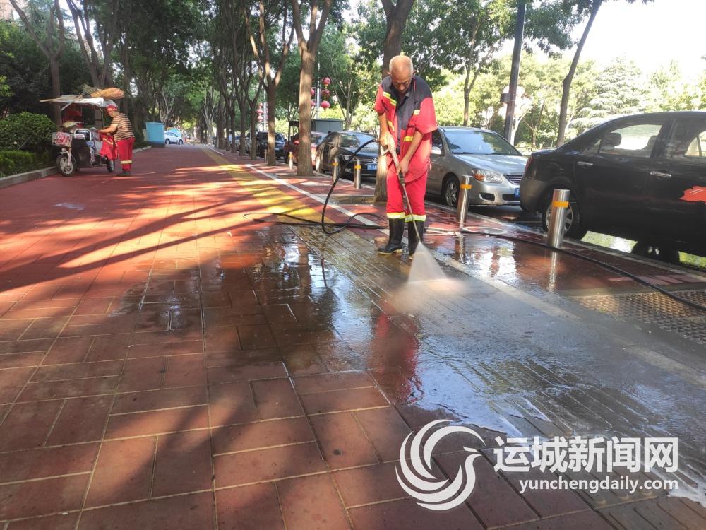在河东东街与学苑路交叉口的渠化岛,两名环卫工人手持高压水管仔细冲洗道路上的尘土和杂物,另外两名环卫工人用扫帚对杂物进行清理。冲洗后的渠化岛,颜色更加显眼漂亮,成为城市街头一道亮丽的风景线。