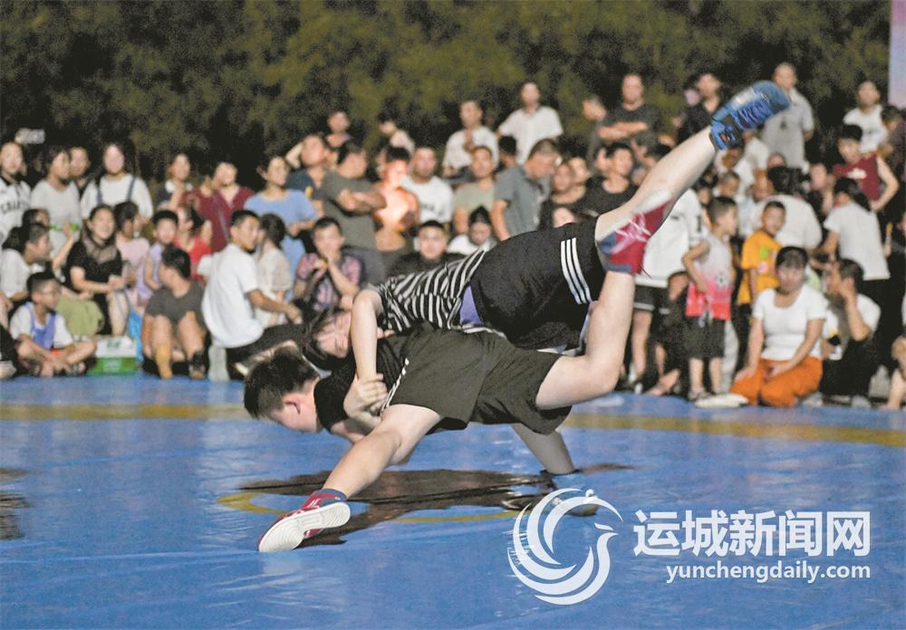 8月5日晚,稷山县2023年全民健身日传统摔跤挠羊赛在该县国家板枣公园秋霞楼广场开赛,来自运城、湖北荆州等地的100余名运动员和摔跤爱好者参加比赛。图为两名摔跤手在进行激烈角逐。