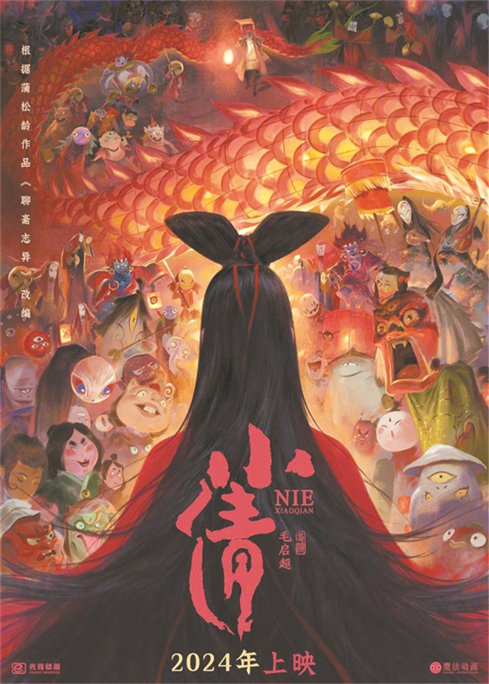 动画电影《小倩》近日发布海报,宣布影片将于2024年上映。海报中,黑发红衣的小倩背对画面,真容引人遐想。影片改编自《聊斋志异》之《聂小倩》,以秀才宁生在兰若寺意外救下女鬼小倩为起点,讲述二人在亡命天涯过程中相知相爱的故事。