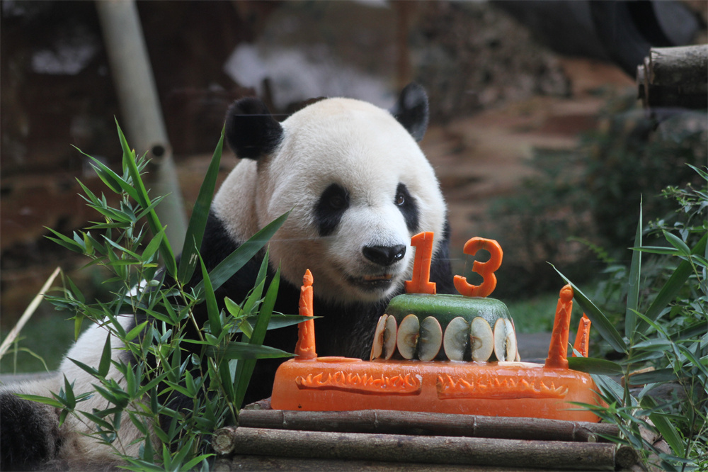 8月5日,在印度尼西亚茂物的印尼野生动物园,大熊猫“彩陶”享用“生日蛋糕”。