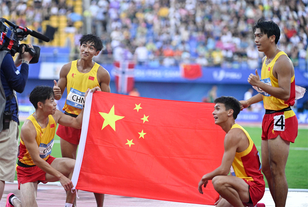 当日,在成都举行的第31届世界大学生夏季运动会田径项目男子4×100米接力决赛中,中国队以38秒80的成绩获得冠军。