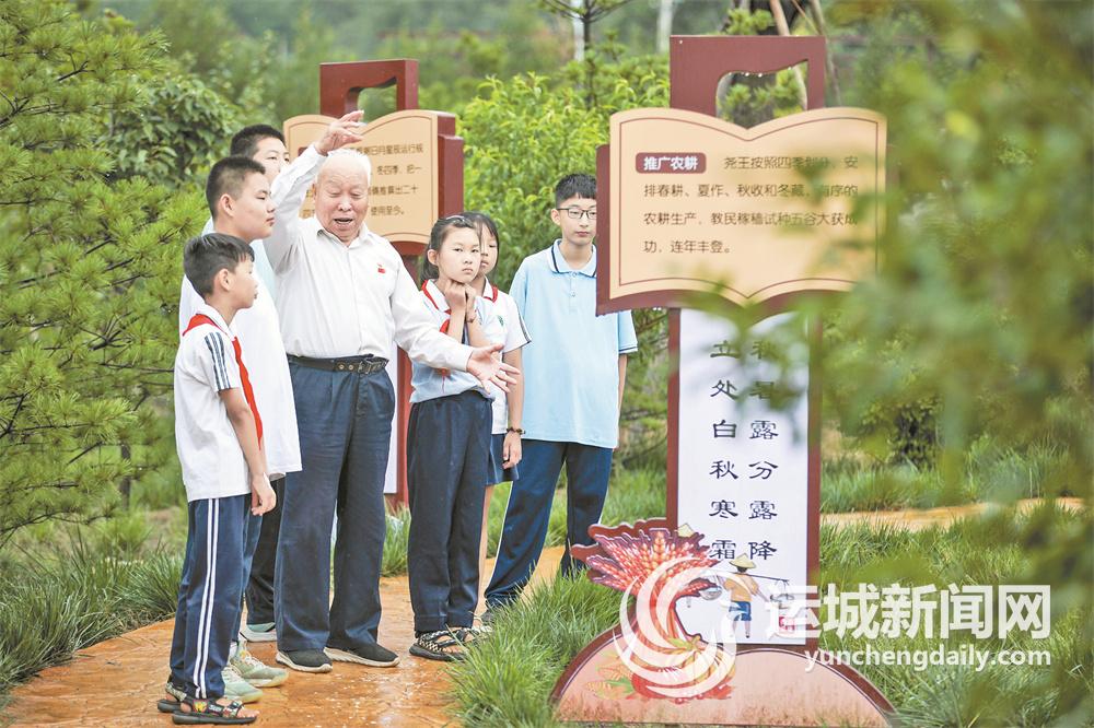 在古绛镇尧寓村文明新风公园里,非遗文化传承人李友益给孩子们讲述尧的传说(资料图片)。