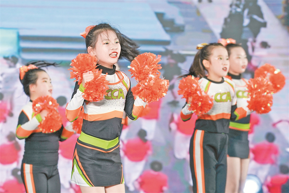 8月8日,小朋友们在活动中进行啦啦操表演。