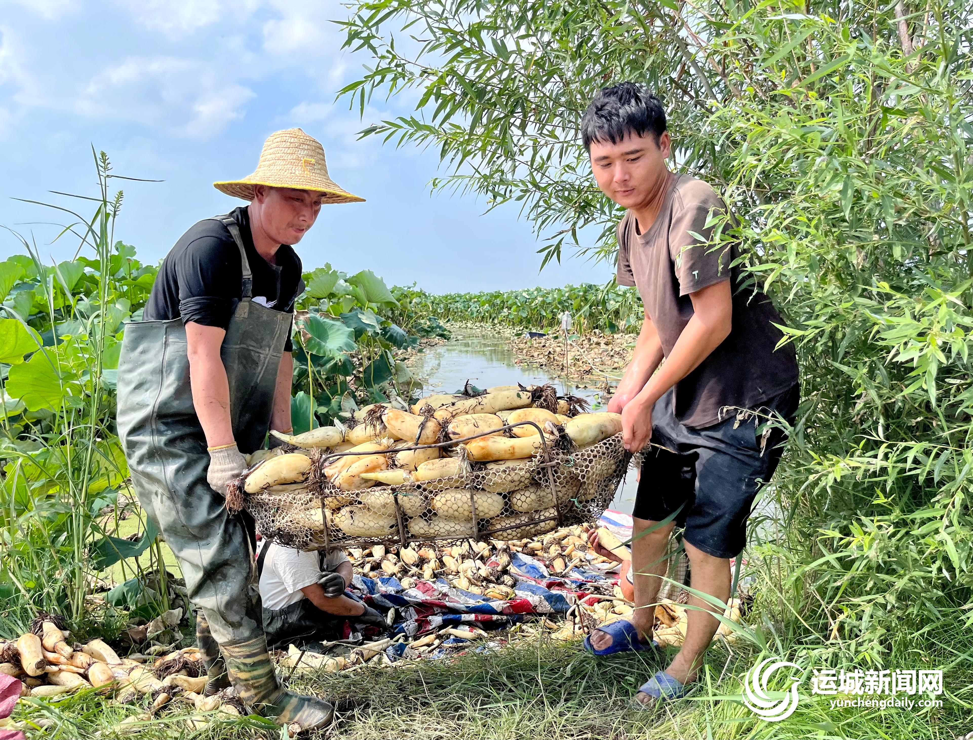 8月8日,永济市韩阳镇黄河滩地,农户们正在采收莲藕。