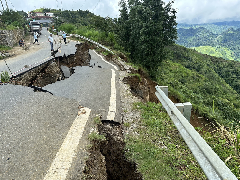8月5日,在越南莱州省,道路因山体滑坡受损。越南国家预防自然灾害指导委员会8日说,持续强降雨在越南北部引发洪水和山体滑坡,自2日以来已造成11人死亡、5人受伤。