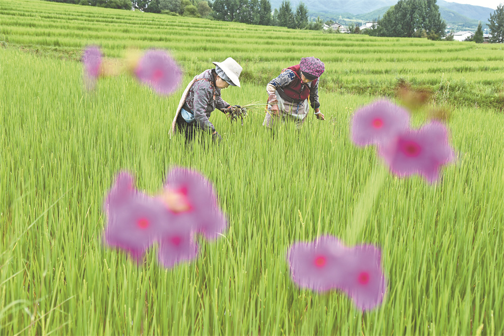 8月7日,在云南省大理白族自治州剑川县马登镇文屏村,村民在水稻田里除草。 新华社发(赵庆祖 摄)
