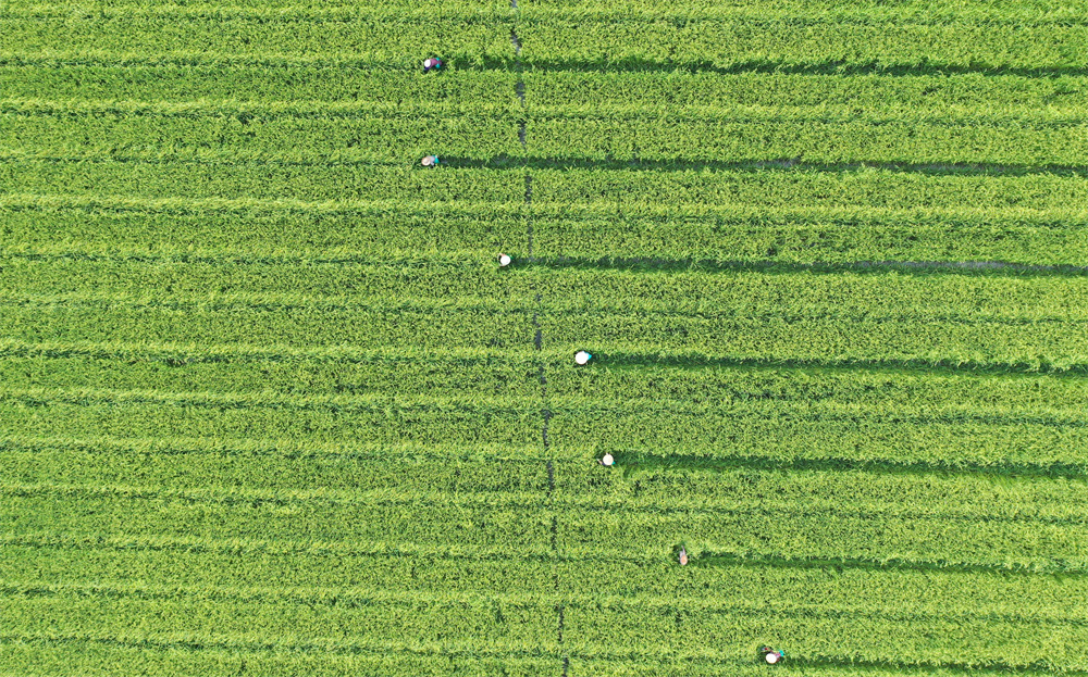 8月5日,四川省眉山市东坡区复兴粮经现代农业园区,村民在水稻制种田里开展去杂作业(无人机照片)。新华社发(姚永亮 摄)