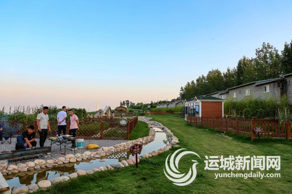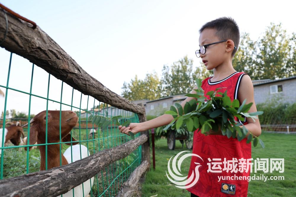 8月12日,平陆县张店镇风口村一家庭农场内,游客在体验田园乐趣。