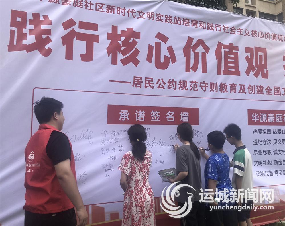 运城晚报讯(记者 刘凯华)8月11日下午,盐湖区华源豪庭社区新时代文明实践站组织辖区居民在小区广场开展“践行核心价值观 携手共建文明城”宣传教育活动。
