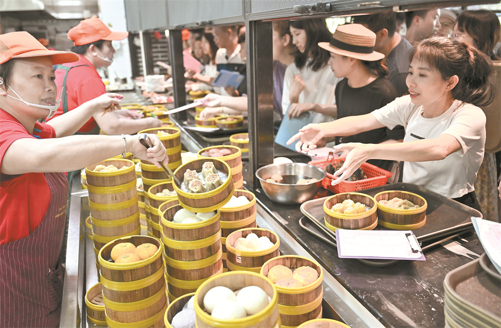 8月13日,顾客在海南文昌的一家老爸茶馆取餐。遍布海南岛的老爸茶是海南地方饮食文化的一大特色。一壶茶、几样点心,经济实惠的老爸茶馆是本地居民休闲消遣的好去处。随着茶点品类日渐丰富、就餐环境越来越好,老爸茶馆也成了游客来海南旅游常去的“打卡地”。新华社记者 郭程 摄