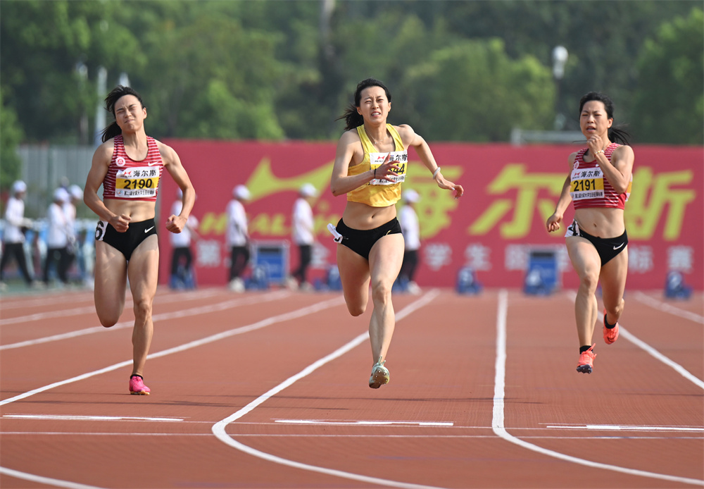 当日,在安徽合肥举行的第21届全国大学生田径锦标赛女子丁组100米决赛中,武汉理工大学选手许佳璐以11秒63获得冠军。 新华社记者 周牧 摄