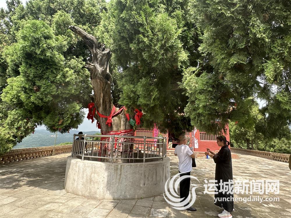 拾级而上,红墙青瓦的山神庙映入眼帘,庙前一棵需三四人合抱的千年古柏巍然耸立,郁郁葱葱,树冠如盖,浓荫蔽日。古柏没有具体考证过树龄,但其粗壮和雄奇,可与颇负盛名的舜帝陵古柏相媲美,足见年代之久远。