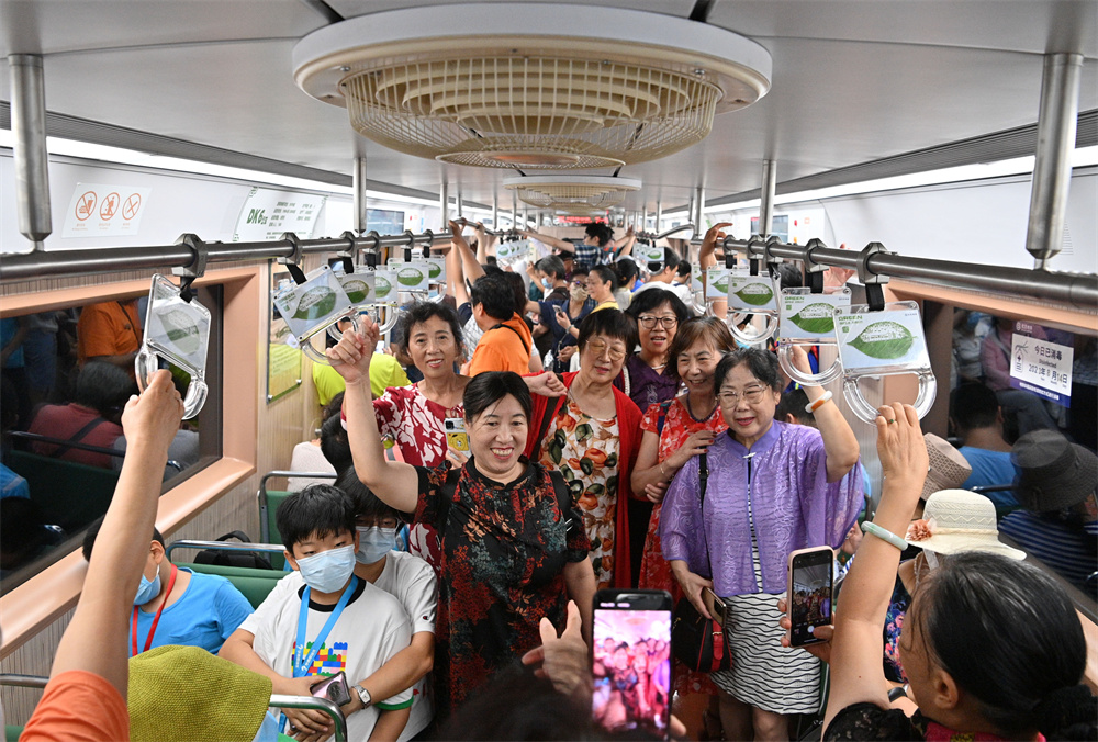 8月14日,乘客在北京地铁一号线“时光列车”上拍照留念。