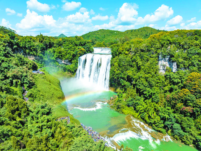 这是8月16日拍摄的贵州省安顺市黄果树瀑布(无人机照片)。 初秋时节,位于贵州省安顺市的黄果树瀑布景区进入一年中的最佳观赏期。大瀑布奔腾而下、气势磅礴,前来观赏游玩的游客络绎不绝。 新华社发(陈 熙 摄)