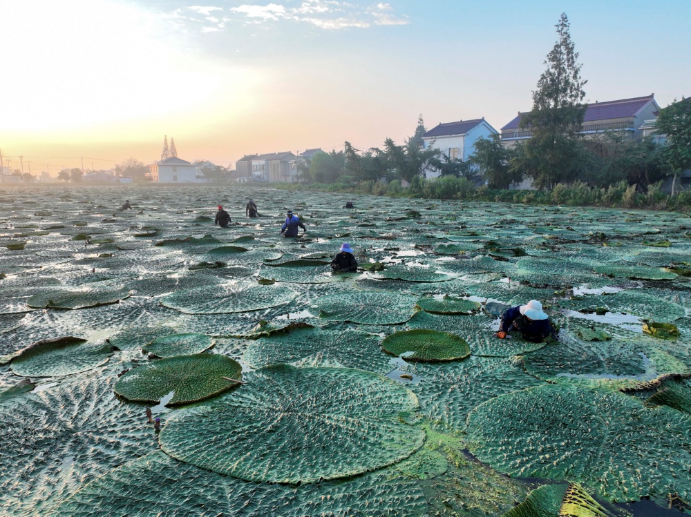 8月18日,泰州市姜堰区顾高镇种植的芡实进入成熟期,种植户组织人力采收,芡实种植基地呈现一派繁忙的丰收景象。新华社发(顾继红 摄)