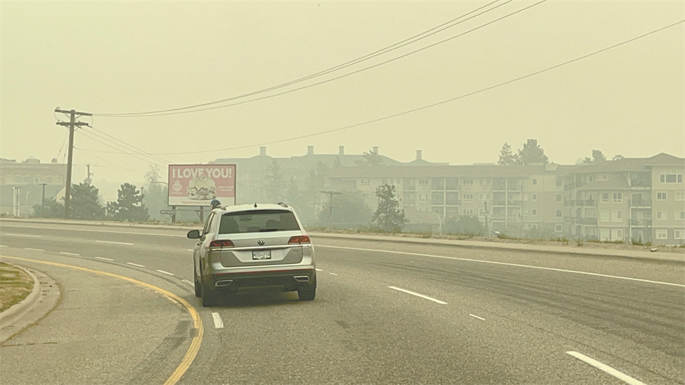 8月20日,在加拿大基洛纳,车辆在野火烟霾笼罩中的道路上行驶。连日来,加拿大西部森林火灾持续蔓延。加拿大不列颠哥伦比亚省政府19日宣布对受野火影响的基洛纳、西基洛纳、坎卢普斯等地区实施非必要旅行限制,以确保为疏散群众或参与灭火人员提供足够临时住所。