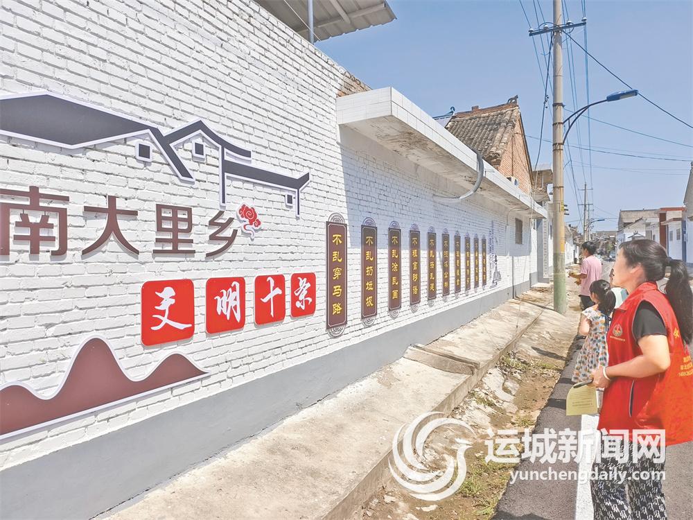 8月22日,村民在夏县南大里乡街道上观看以“倡导文明新风、共建美好家园”为主题的乡规民约墙。