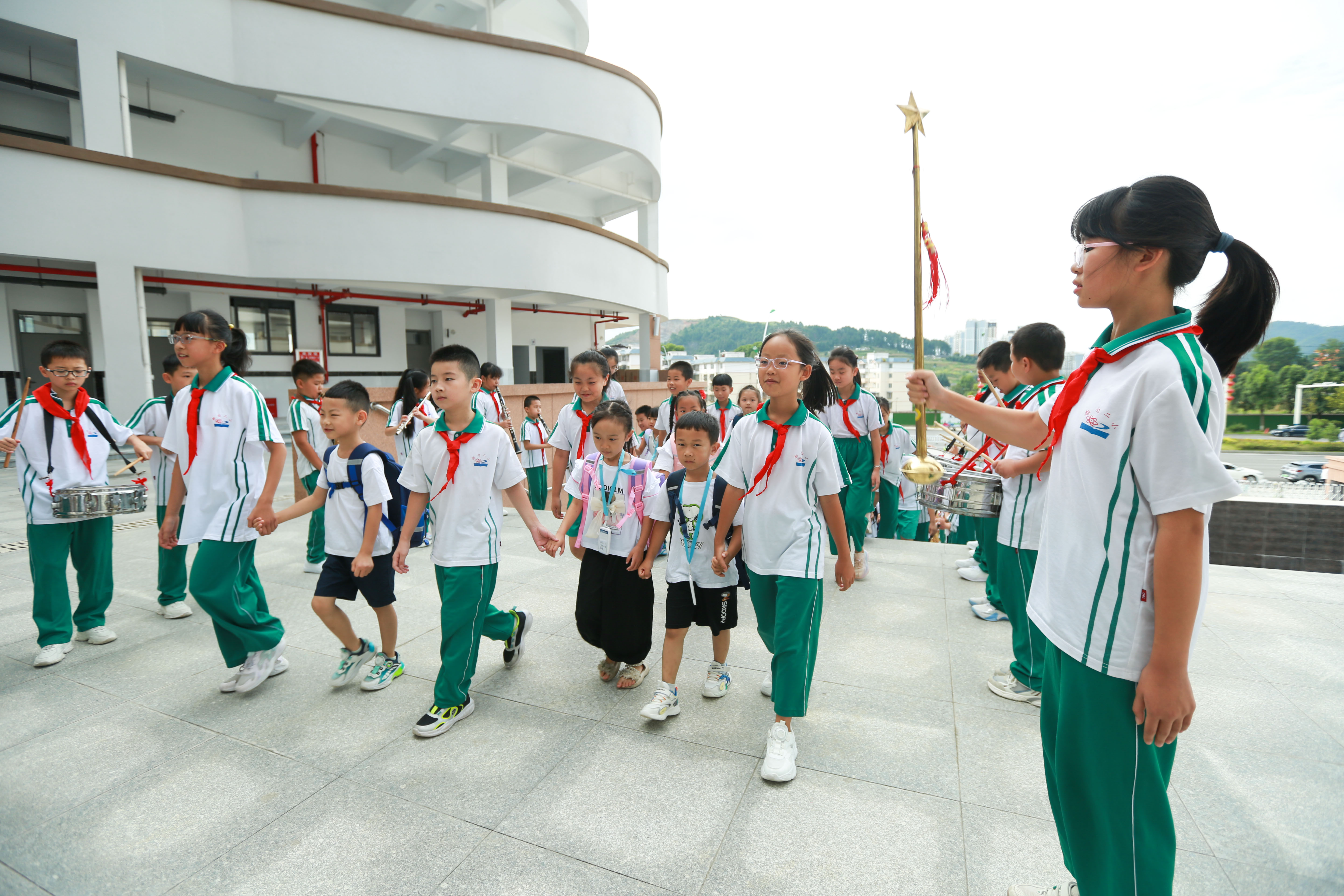8月21日,贵州省都匀市第二完全小学高年级的同学带领一年级新生参观校园。