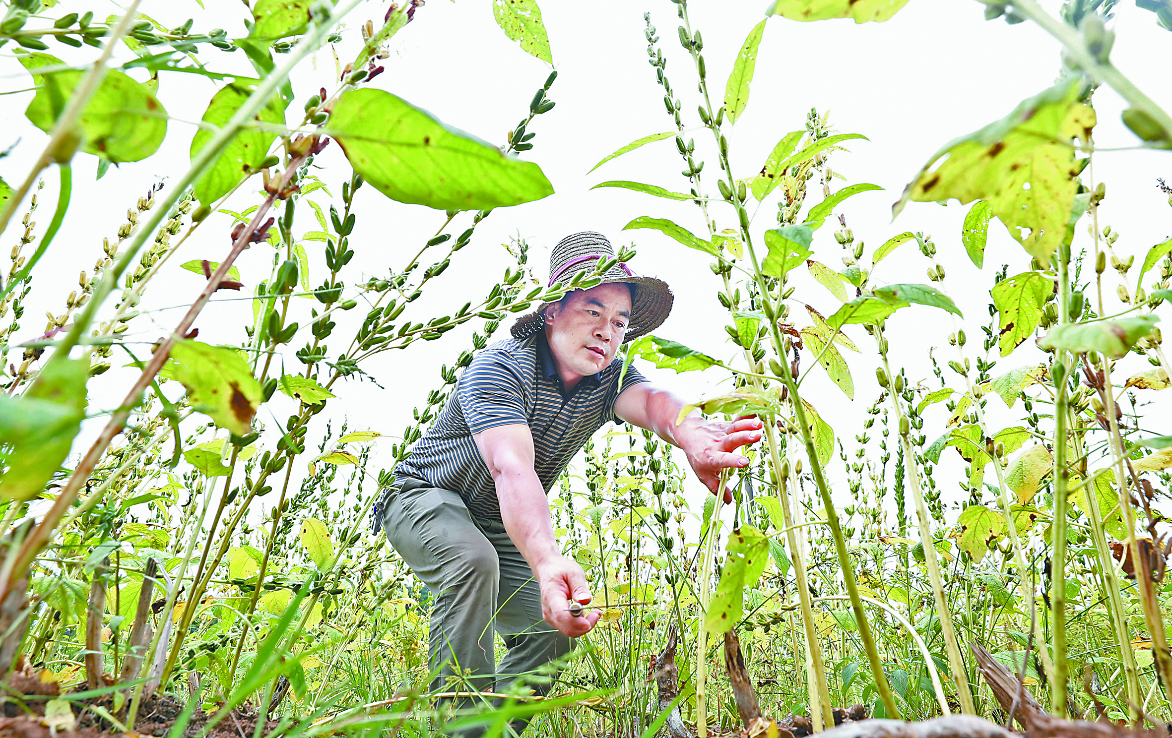 左下图:8月21日,在湖南省衡阳市衡东县大浦镇,当地村民在收割芝麻。