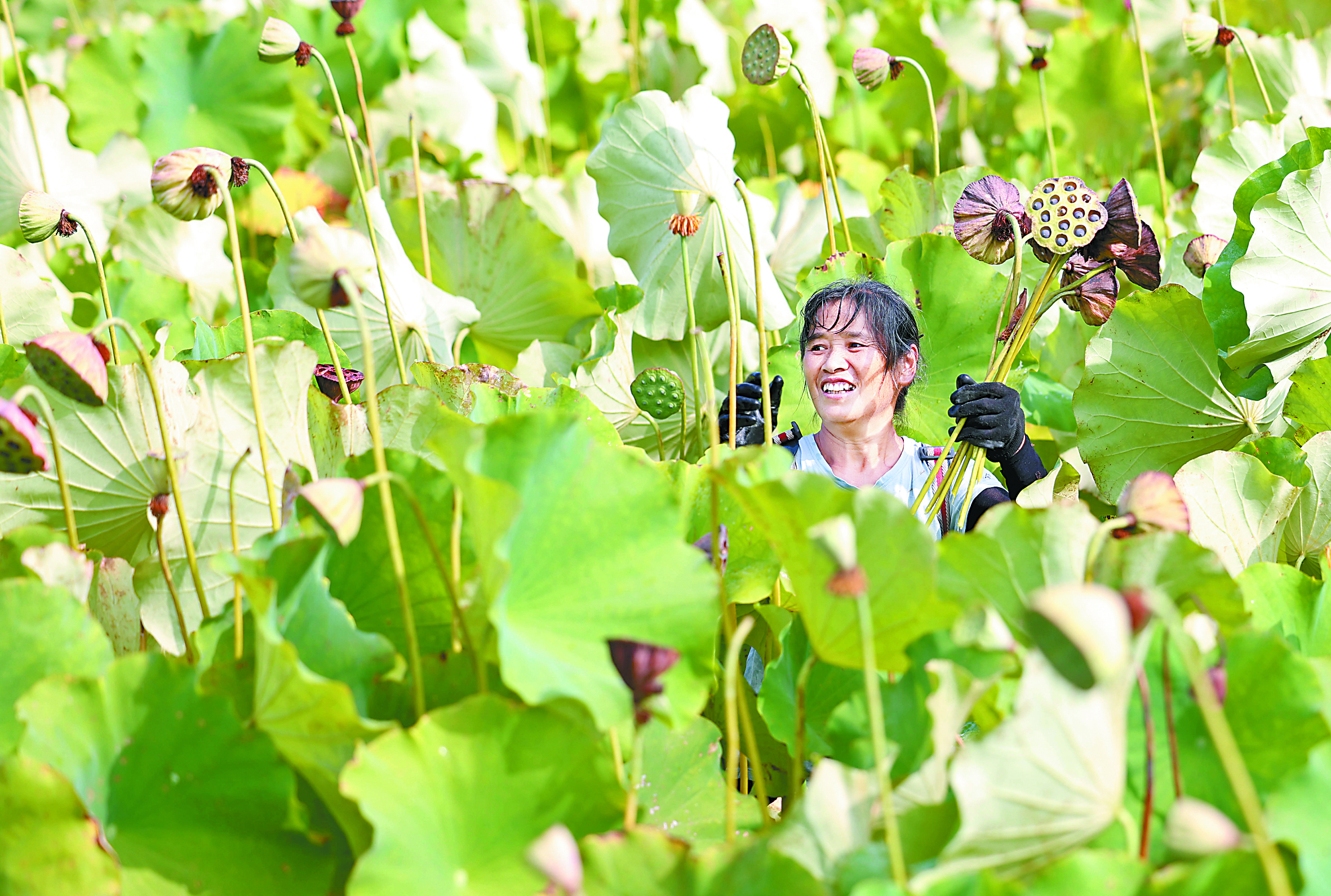左 图:8月22日,在贵州省黔东南苗族侗族自治州岑巩县客楼镇下寨村,村民在采收莲子。