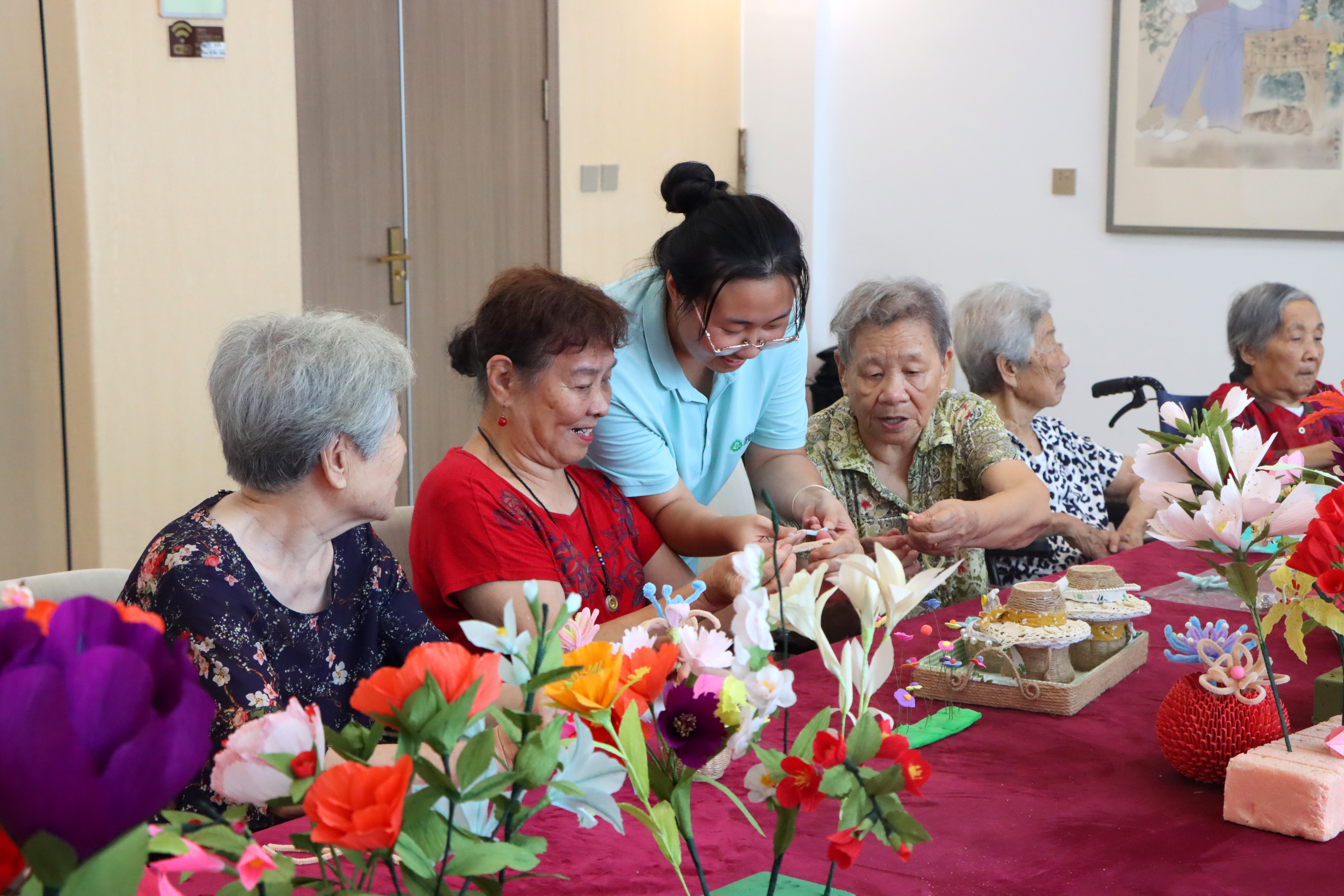 8月21日,老人在山东省滨州市沾化区大高镇国昌怡心园的护工指导下编织手工作品。