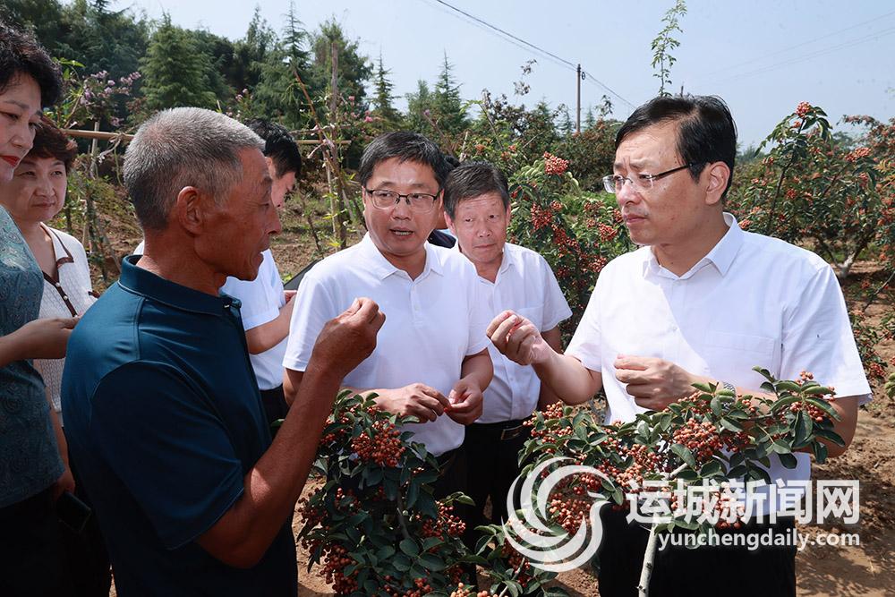 花椒是芮城县的特色农业产业和群众增收致富的主导产业之一。目前,全县种植花椒12.5万余亩,年产值约3.74亿元。在该县风陵渡镇晋椒1号示范园,成熟的花椒挂满枝头,椒香味儿弥漫山间,电商直播如火如荼。丁小强走进花椒地和义平花椒专业合作社等处,仔细询问花椒价格、市场行情、亩均产量,及需要政府部门帮助解决的问题,察看电商销售、合作社发展等情况。他强调,要大力推进花椒产业转型升级,实现由初级加工向精深加工的全产业链发展,不断提高芮城花椒知名度、美誉度和市场占有率,切实把小花椒做成大产业。政府和相关部门要加强水利设施配套建设,帮助椒农做好病虫害防治,标准化、规范化做好花椒烘干、存储等加工程序,注重电商平台品牌建设,努力打造全国知名的优质花椒生产基地和加工集聚地。