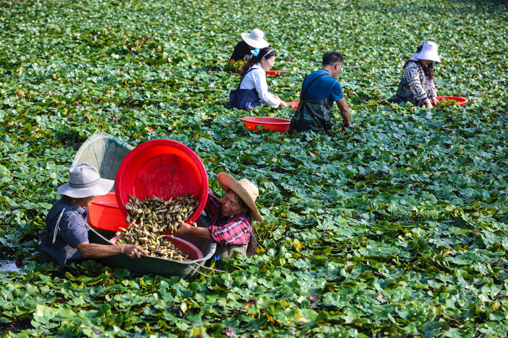 8月24日,河南省信阳市光山县司马光小镇升辉合作社农民在采摘菱角。