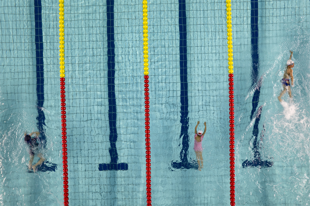 8月27日,在永济体育中心游泳馆内,孩子们在暑期游泳竞技与趣味赛暨永济市青少年游泳队人才选拔赛上奋力冲刺。
