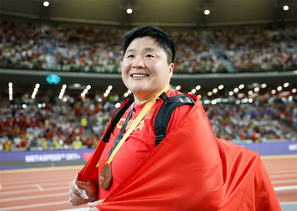 8月26日,中国选手巩立姣在决赛后身披国旗庆祝。