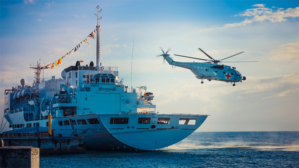8月24日,中国海军“和平方舟”号医院船靠泊所罗门群岛霍尼亚拉港期间,舰载医疗救护直升机赴外岛开展巡诊服务。