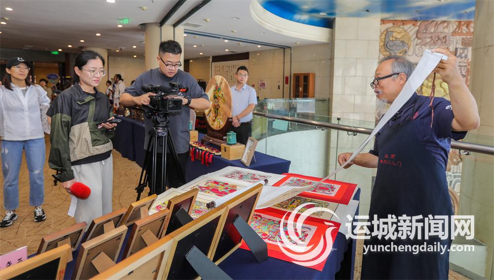 8月28日早9时,第34届关公文化旅游节发布会会场门外,我市非物质文化遗产与关公文创产品率先亮相。展台上摆放着绛州木版年画、掐丝珐琅、绛州澄泥砚、周氏泥面塑、鑫瑞华青铜雕塑、永乐桃木雕刻、金钱石雕和关公文创。