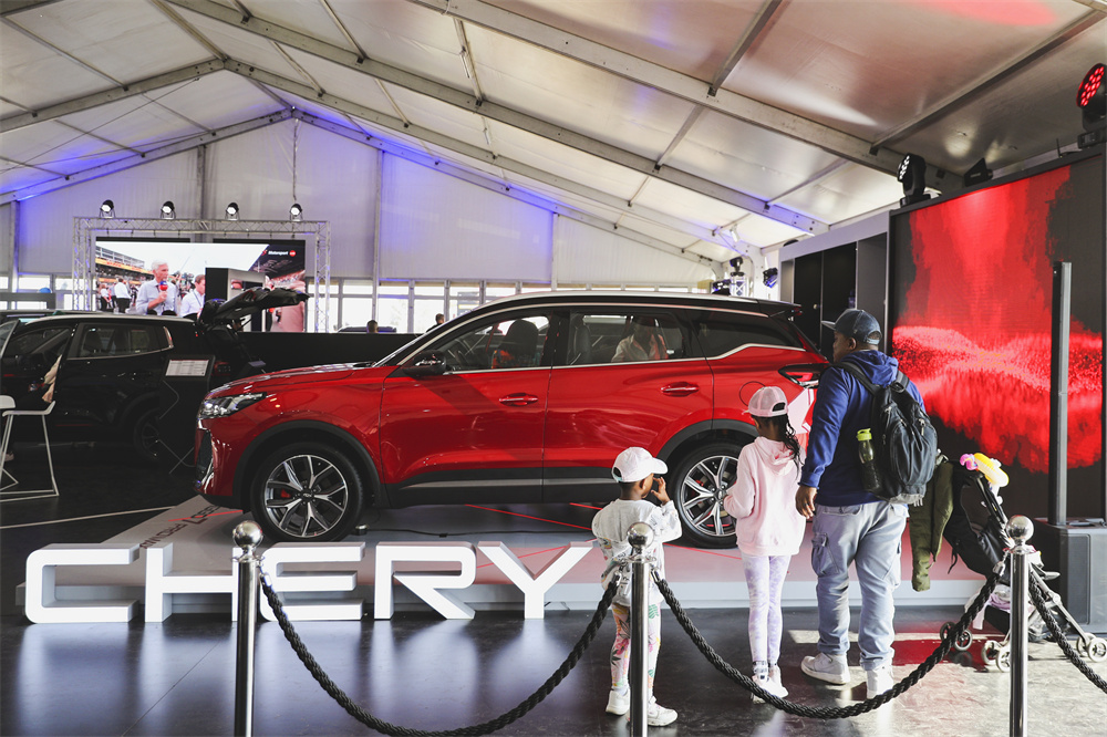 8月27日,在南非约翰内斯堡,参观者在奇瑞展厅参观展车。第6届约翰内斯堡汽车节于8月25日至27日举行,中国汽车品牌亮相汽车节,吸引了众多当地民众参观、体验。