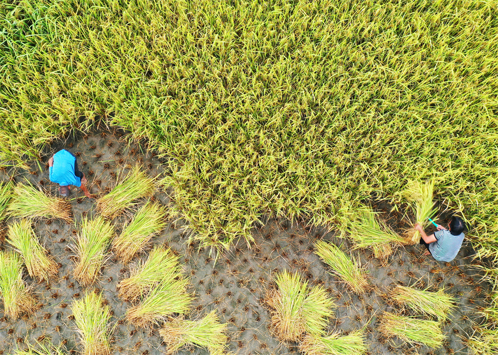 8月30日,农民在湖南省郴州市嘉禾县珠泉镇车头村收割水稻(无人机照片)。 新华社发(黄春涛 摄)