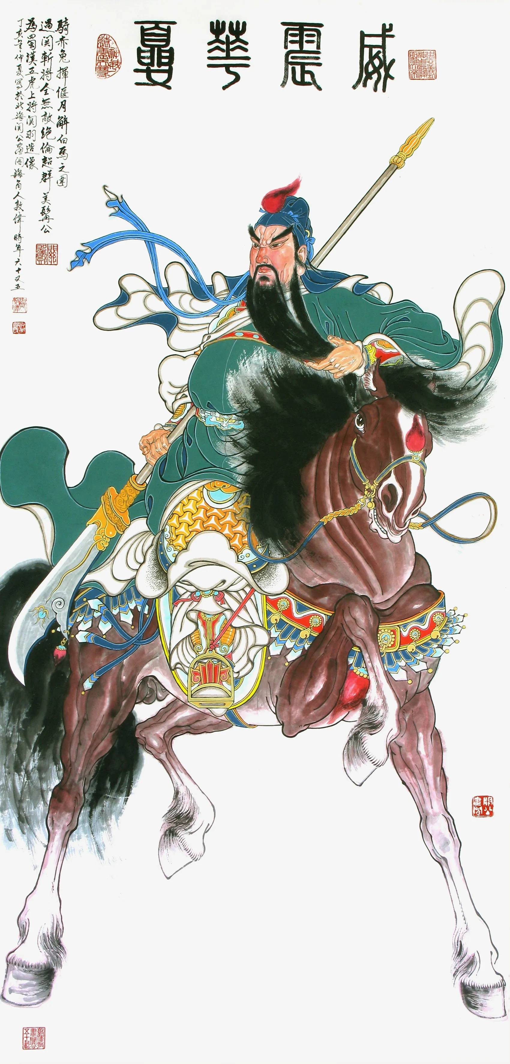 关公单刀赴会时,青巾绿袍,稳坐船头,身边周仓捧着大刀。离开时,关公假装醉酒,扯着鲁肃为人质,安安全全到江边,众吴兵目瞪口呆地看着关公登船“乘风而去”,却不敢出手。此举可谓儒雅之极、机智之极、超然之极!