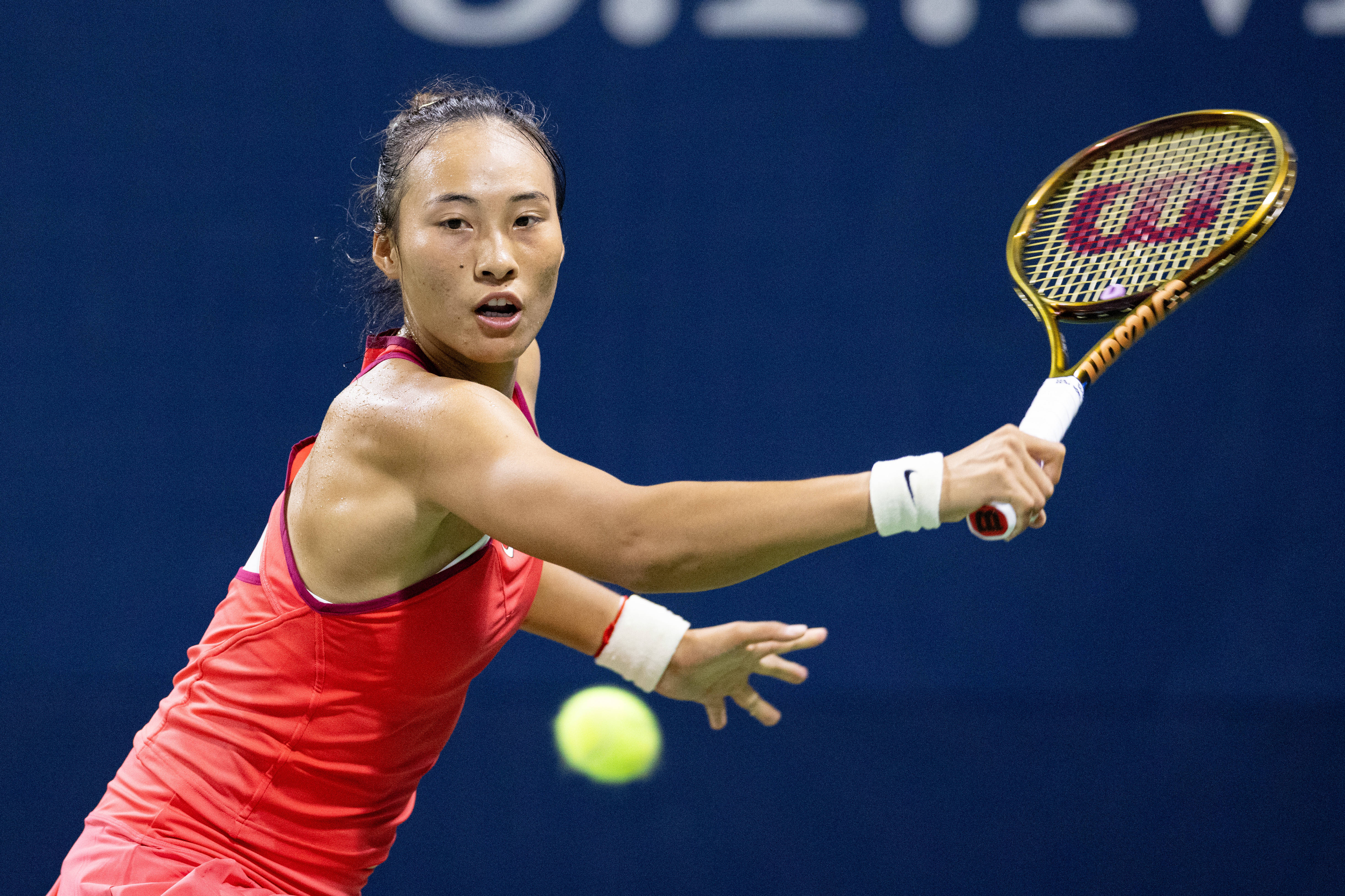 郑钦文在比赛中回球